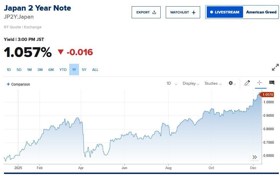 智通财经APP获悉,由于加息预期升温以及对财政景况的担忧,日本国债收益率近期握续走高。日本10年期国债收益率在12月8日一度飙升至1.97%,创下自2007年以6月来的最高水平;对战术敏锐的日本2年期国债收益率则在12月10日一度飙升至1.075%,创下2007年7月以来的最高水平。适度发稿,日本10年期国债收益率报1.928%,日本2年期国债收益率报1.057%。
